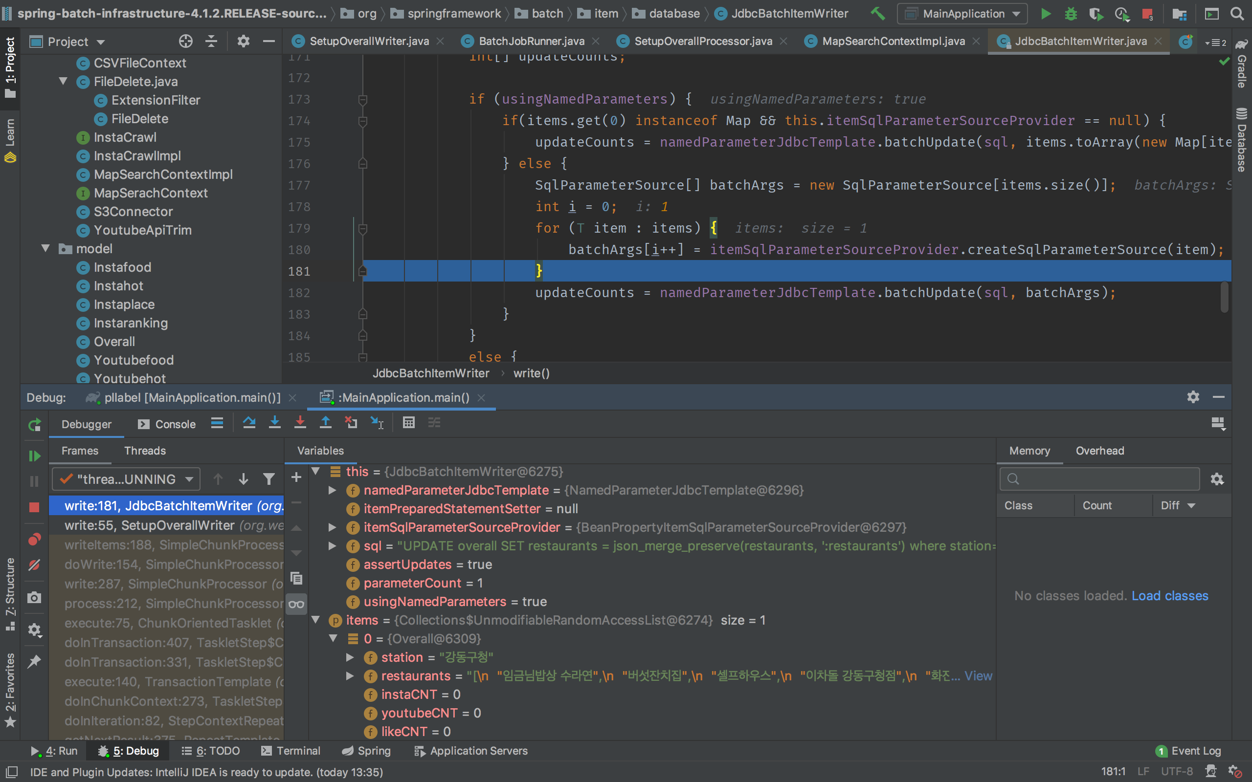 세팅한 sql, items 내에 있는 Overall 필드가 모두 잘 들어와있지만, jdbcBatchItemWriter.java 내의 로컬변수인 parameterCount가 1로 들어와 있음을 알 수 있다.